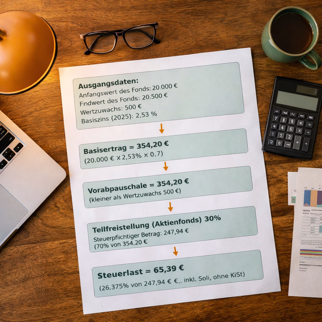Beispiel: Ihr Fonds startet mit 20.000 Euro und endet mit 20.500 Euro. Gewinn 500 Euro. Der Basiszins für 2025 ergibt einen Basisertrag von ca. 354 Euro (20.000 × 2,53% × 0,7). Kleiner von 500 und 354 ist 354 – folglich werden 354 Euro als Vorabpauschale angesetzt. Wäre der Gewinn geringer als der Basisertrag (200 Euro), dann würde eben dieser geringere Betrag versteuert. Keine Gewinne bedeuten natürlich keine Vorabpauschale.